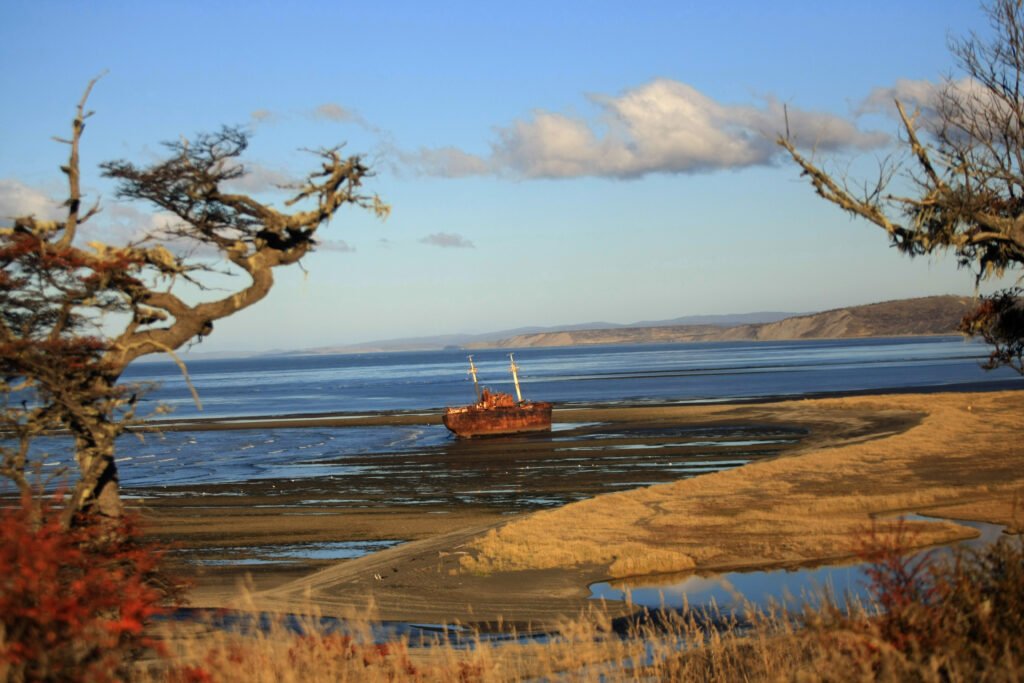 • El Desdémona, el barco encallado que parece sacado de una película, oxidado y poderoso frente al mar fueguino.