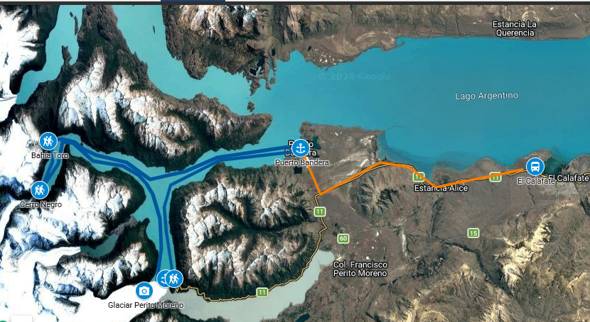 🚢 Navegación por el Brazo Mayo Partimos desde Puerto Bandera a bordo de una moderna embarcación, navegando el Brazo Rico del Lago Argentino. En el trayecto, nos adentraremos en el Brazo Mayo, un sector menos explorado del parque, rodeado de un paisaje imponente.