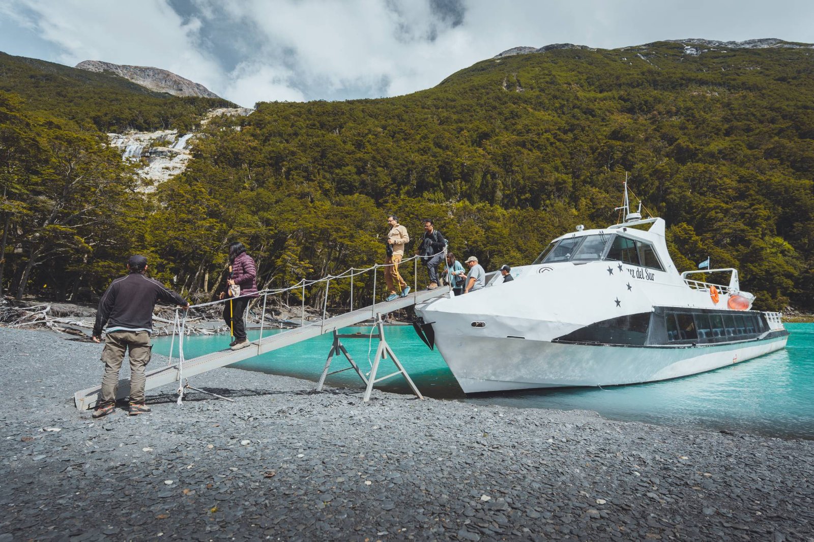 💦 Segundo trekking – Cascada y Glaciar Negro Luego de regresar a la embarcación, continuamos la travesía hasta el Glaciar Negro, donde realizaremos otro trekking fascinante. Este sendero nos conducirá a una cascada escondida y a un impactante mirador con vistas a un glaciar de tonalidades oscuras, una rareza en la región.